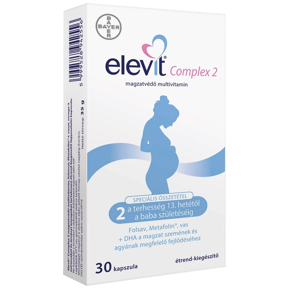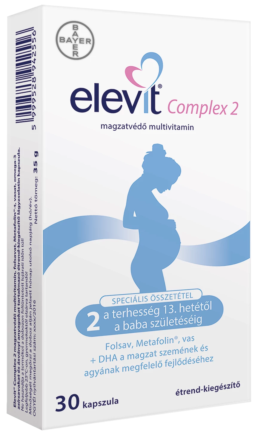 A terhesség különböző szakaszaiban mind a baba, mind pedig a mama tápanyagigényei változnak. Az Elevit Complex 2 megfelelő mennyiségben tartalmaz olyan mikrotápanyagokat, amelyre terhességed tizenharmadik hetétől szüksége van a kisbabádnak és neked. Nemcsak folsavat, Metafolint és vasat tartalmaz, de DHA-t is a magzat szemének és agyának megfelelő fejlődéséhez.