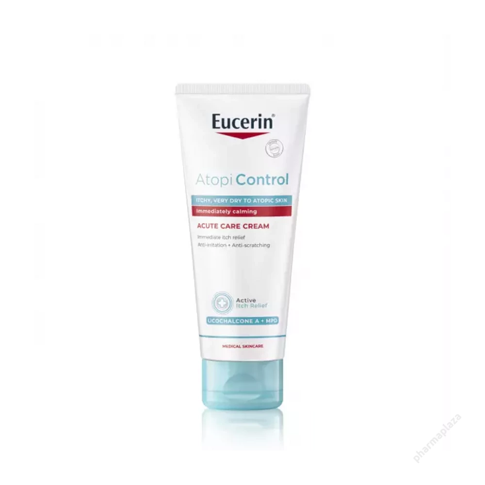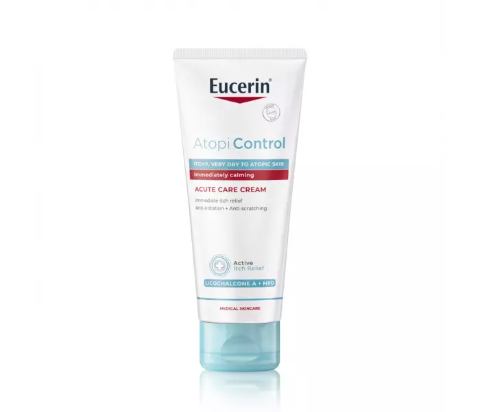 Eucerin AtopiControl SOS bőrnyugtató krém 100ml Intensive care cream for flare-ups of Atopic Dermatitis Az Eucerin® AtopiControl SOS Bőrnyugtató krém bőrnyugtató, ápoló formulájával segít megtörni a viszketéssel járó akut bőrgyulladásos ciklus ördögi körét. Bőrápoló tulajdonságainak köszönhetően segít csökkenteni a hidrokortizon használatát a gyulladás fellángolásának ideje alatt. Egy klinikai vizsgálat bizonyította, hogy az Eucerin® AtopiControl SOS Bőrnyugtató krém bőrápoló tulajdonságainak köszönhetően hasonló kozmetikai hatást eredményezett az atópiás bőr kipirosodásának javulásában, mint az 1%-os hidrokortizon krém. Az AtopiControl SOS Bőrnyugtató krém nem minősül gyógyszernek, és nem helyettesíti azt.