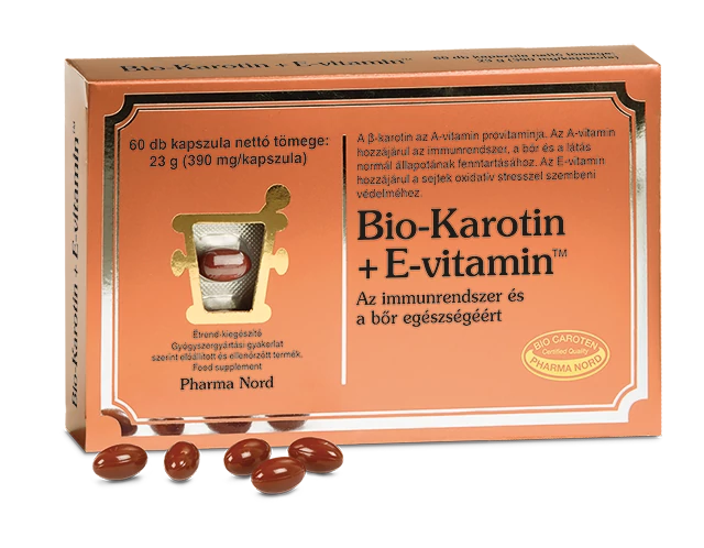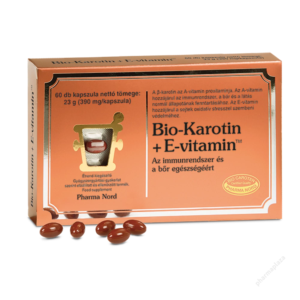 A Bio-Karotin + E-vitamin 4,5 mg felszívódásre kész β-karotint tartalmaz kapszulánként, ami nagyjából megegyezik 2 nagy sárgarépában található β-karotin mennyiségéval. A β-karotin a szervezet igénye szerint részben A-vitaminná alakul át, részben elraktározódik a bőrben. A β-karotin E-vitaminnal kombinálva erélyes antioxidáns, semlegesíti a szervezetben keletkezett káros szabadgyököket. Hatása hosszabb ideig tart, mint az A-vitaminé.