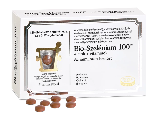 A Bio-Szelénium 100+Cink+Vitaminok 100 μg SelenoPrecise-t tartalmaz, mely a Pharma Nord szabadalmaztatott szerves kötésű és magas felszívódással rendelkező szelénes élesztője. Ez az élesztő 67% L-selenomethionint és 33% másfajta különböző szelén fajtát tartalmaz. A szelén hatását és felszívódását erősítí, ha A, B6, C, E vitaminokkal és cinkkel kombinálják. *NRV: Táplálkozási referenciaérték felnőtteknek. Adagolás: Napi 1 tabletta étkezés közben |