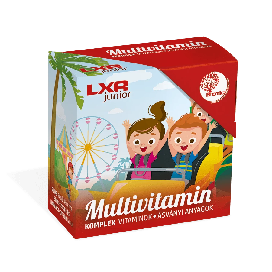LXR JUNIOR MULTIVITAMIN KOMPLEX: Közismert, hogy az élelmiszerek tápanyagtartalmának csökkenése miatt a normál táplálkozással egyre nehezebben juttathatók a szervezetbe a biológiailag értékes anyagok. Emellett számos gyermek évekig nem vehető rá a tartalmas étkezésre, vagy ételallergiák és intoleranciák miatt nem fogyaszthat bizonyos élelmiszereket. Az LXR Junior Multivitamin Komplex gazdag vitamin- és ásványianyag-összetétele a gyermekek fejlődő szervezetének szükségleteihez igazodik. A rágótabletta formula kétféle gyümölcsös ízesítés mellett teszi lehetővé a hatóanyagok érdemi mennyiségeinek kombinációját. A készítményben jól felszívódó, szerves kötésű ásványi anyagokat (pl. magnézium-citrát, vas-fumarát, cink-biszglicinát), valamint a hasznosulás szempontjából ideális vitaminvegyületeket (pl. B12-vitamin esetében metilkobalamint, folsav esetében metil-folátot) alkalmazunk.