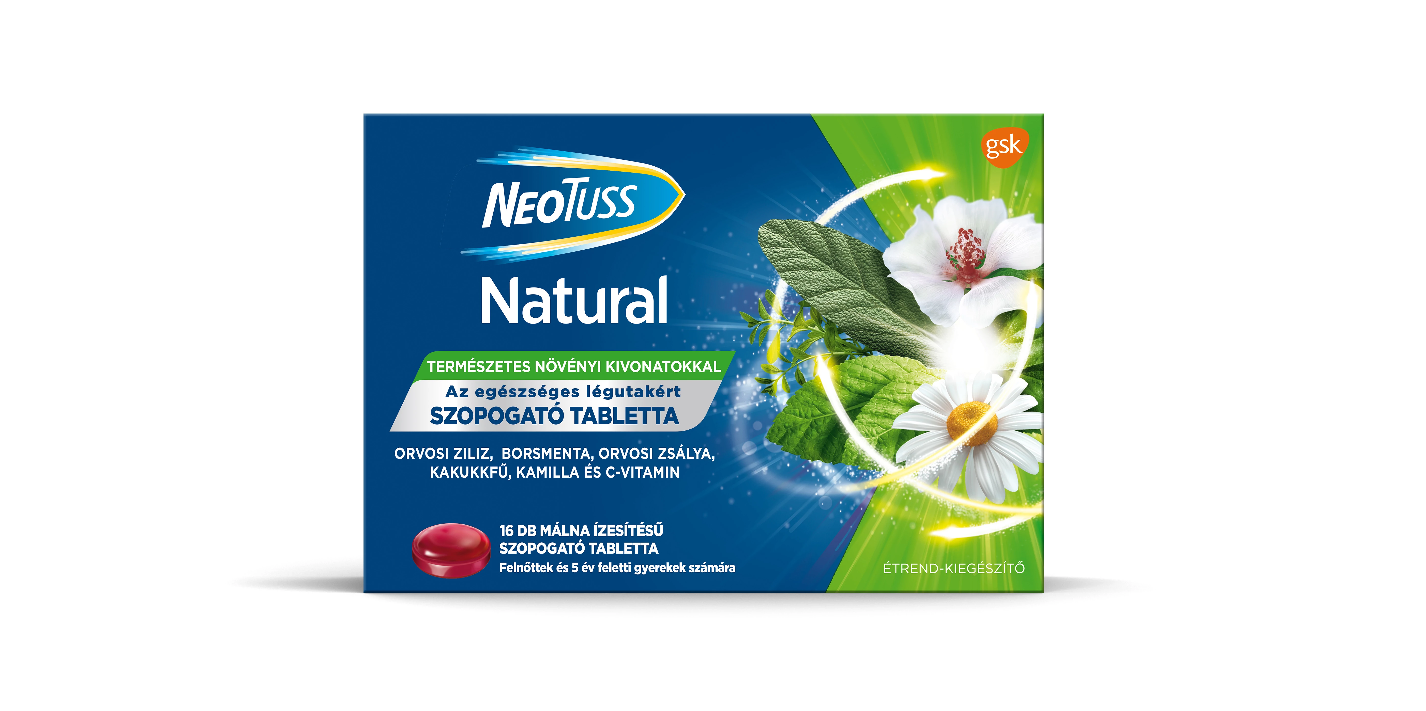 A NeoTuss Natural szopogató tabletta (étrend-kiegészítő készítmény) aktív összetevői támogatják a felső légutak egészségét,