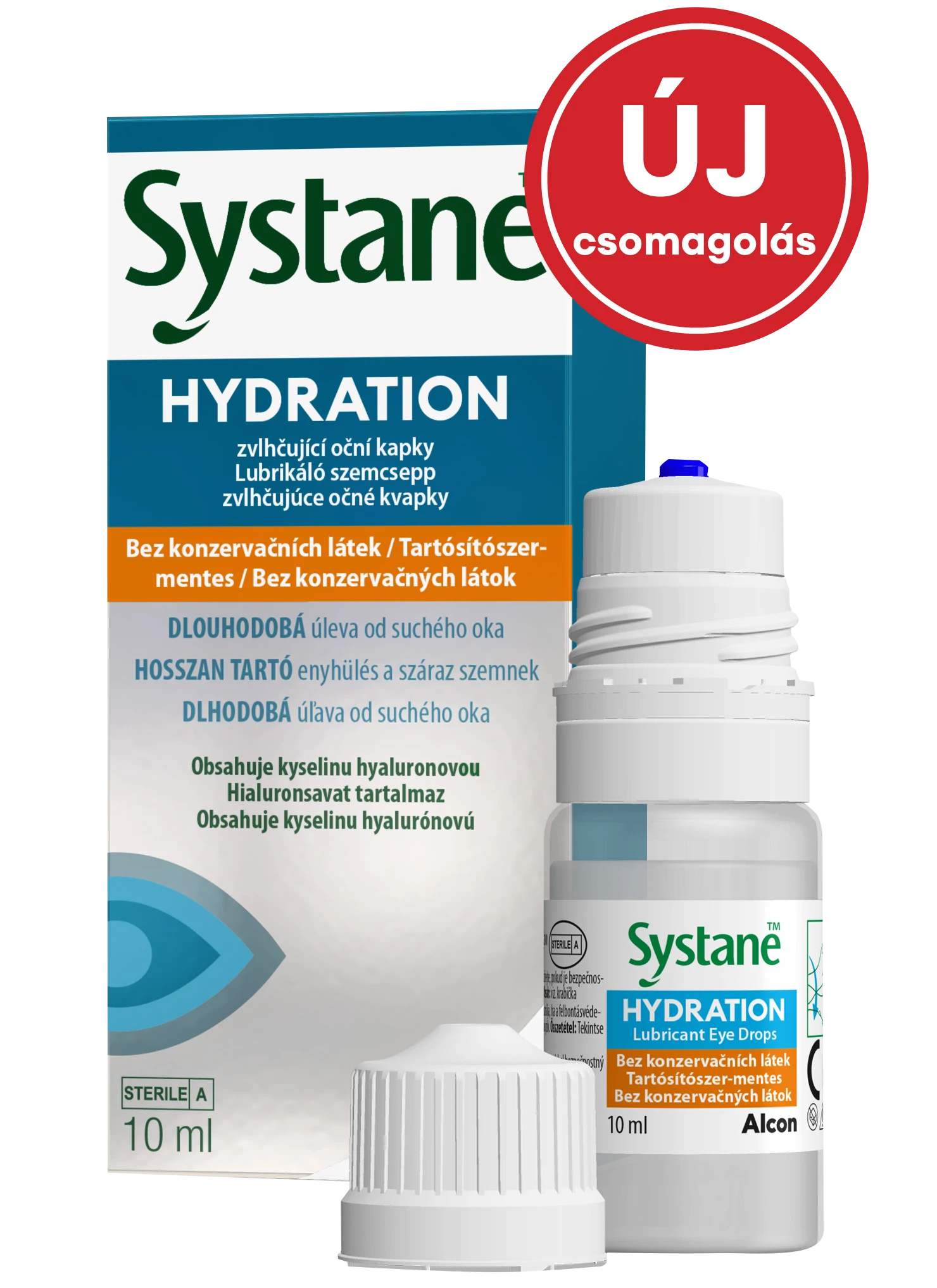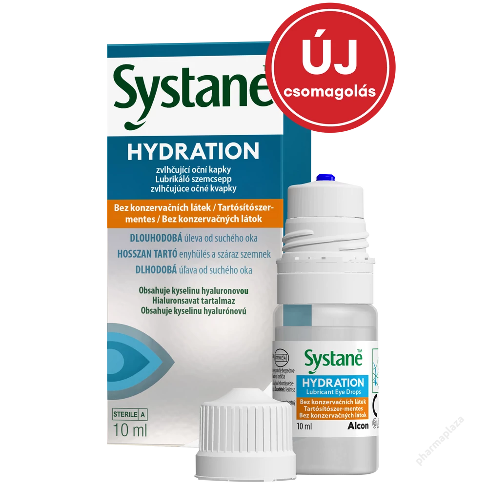 A SYSTANE™ HYDRATION lubrikáló szemcsepp nátrium-hialuronátot, polietilén-glikol 400-at, propilén-glikolt, hidroxipropil-guart, szorbitot, aminometil-propanolt, bórsavat, nátrium-borátot, kálium-kloridot, nátrium-kloridot és tisztított vizet tartalmazó tartósítószer-mentes, steril oldat. A pH helyreállításának céljából sósavat és/vagy nátrium-hidroxidot tartalmazhat.