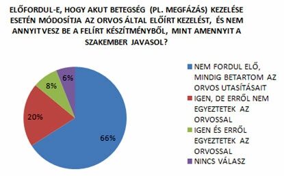 Külön figyelmet igényel, hogy sajnos a krónikus betegek körében sem jobb az utasítást betartók aránya az átlagosnál, csak 73 százalékuk tartja be maradéktalanul az orvosi javaslatot, míg az utasítást megszegők mindössze 15 százaléka egyeztet erről orvosával.